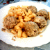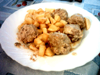Se mezcla la carne con el pan remojado, el huevo, la pimienta y 1/2 ajo picadito, se forman bolitas y se introduce en el interior un trocito de queso, se pasan por harina, se fríen y se reservan. En parte de ese aceite se sofríe la cebolla y el medio ajo restante, cuando ya están, se añaden las almendras machacadas, el vino y la nuez moscada y que este cociendo unos minutos. Se saca un poco de esa salsa y se le añade la leche removiendo bien y despues la mantequilla, todo esto se junta y en ese momento se le añade un trozo del queso, (según gusto) y se pasa por la batidora. Se incorpora a las albóndigas, se comprueba de sal y se deja cocer unos minutos. Si falta salsa se puede añadir un poco más de leche o de agua. Se acompaña con papas fritas cortadas en daditos pequeños.