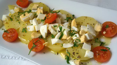 4.- Sazona con un poco de sal las patatas y riega con la vinagreta. Añade los tomates y el huevo duro cortado a dados. Si quieres, puedes añadirle también atún, olivas, anchoas o lo que más te guste.